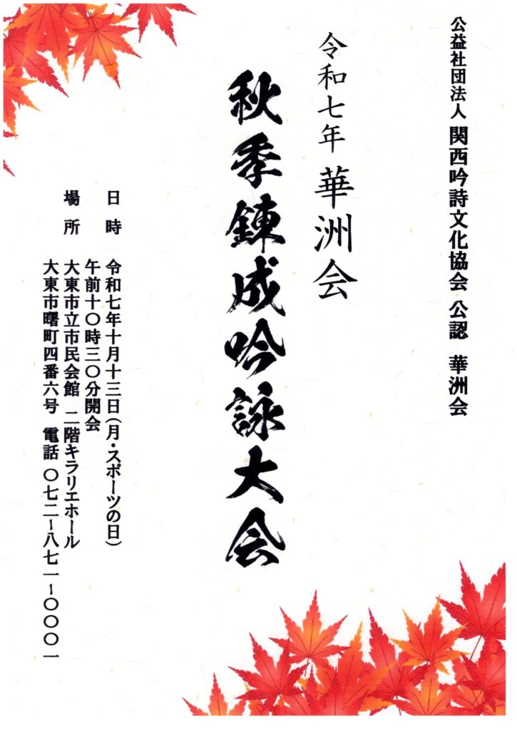 お知らせ令和7年度秋季錬成吟詠大会”紅白華合戦”大盛会裏に開催!!開会式&・吟士権者〈範吟〉堀 彩剡&記念品贈呈 秋季錬成大会ハイライト 審査員&会場紅白華合戦(独吟・連吟合吟・吟詠&剣詩舞・かくし芸・楽器演奏) 〈連吟〉「楠河州の墳に謁して作有り」頼 山陽 大会会長:山口華雋&大会委員長:奥山紅雋 閉会の辞(大会相談役:岡島彩鼓&万歳三唱(大会運営委員長:藤原兗晟) 最高潮に盛上がった懇親会 前の記事