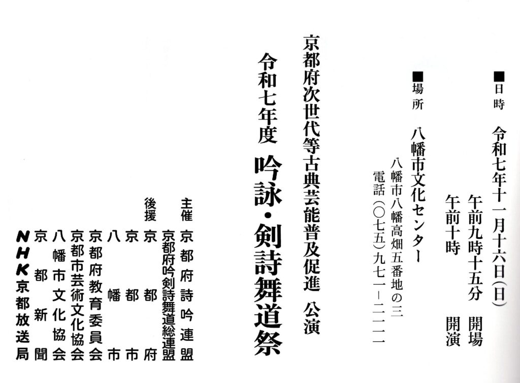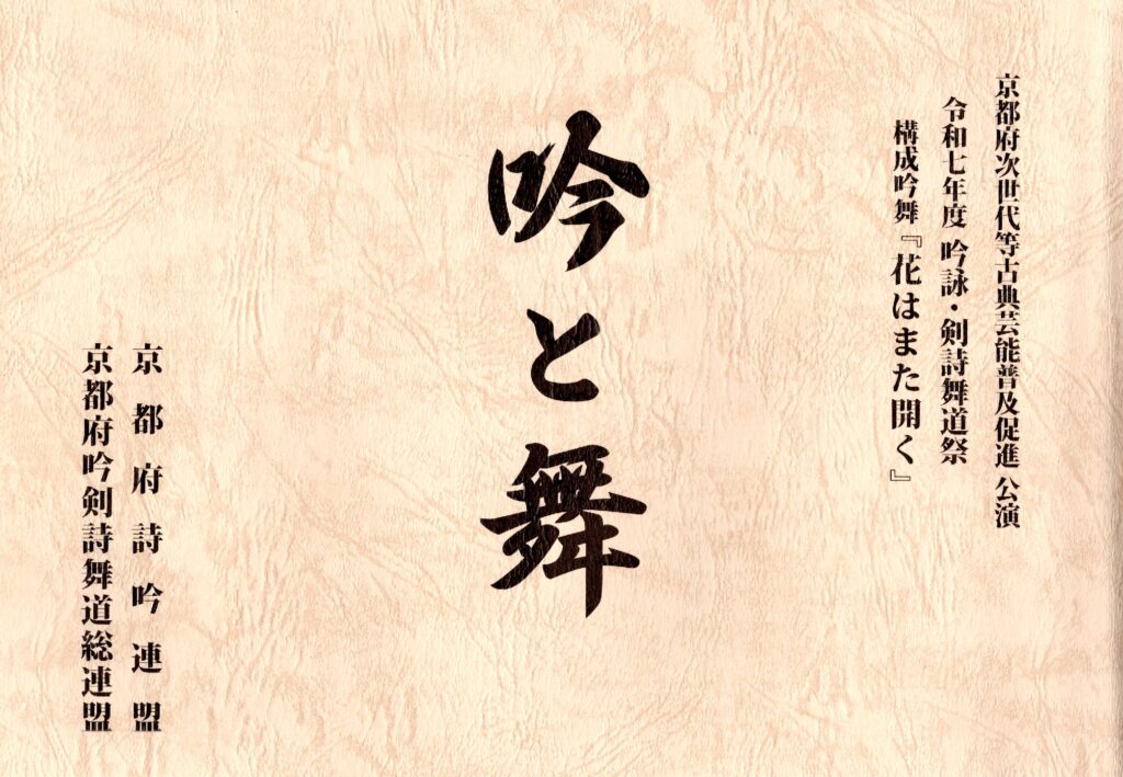 お知らせ令和7年度 吟詠・吟剣詩舞祭『吟と舞』主催:京都府詩吟連盟” 関西吟詩 京都府地区連合会(会長:奥山紅雋)”関係者の出演吟舞紹介幼少年未来塾 吟詠・剣詩舞 ①吟詠「桂林荘雑詠示書生」②剣舞「白虎隊」③詩舞「平泉懐古」 京都府立園部高等学校(京都府立高等学校文化連盟吟詠剣詩舞専門部)吟&剣舞 ①「中 庸」②「生田に宿す」③「大楠公」 構成吟舞『花はまた開く』 『吟と舞』ダイジェスト版 前の記事 次の記事