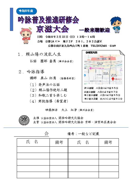 お知らせ令和8年度 吟詠普及推進研修会 ”京滋大会”案内副会長:奥山 紅雋 (京都地区連会長・総本部指導局員)吟詠発声法指導&常任理事会計部長:園部奎雋 講話「頼山陽の波乱の人生」を楽しみましょう!一般来聴歓迎!! 会費:1000円です。 奮ってのご参加をお待ち申し上げます。 前の記事 次の記事